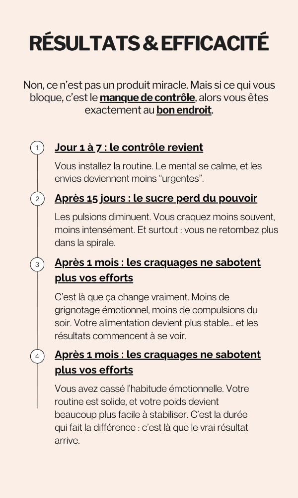 C’est là que ça change vraiment. Moins de grignotage émotionnel, moins de compulsions du soir. Votre alimentation devient plus stable… et les résultats commencent à se voir.